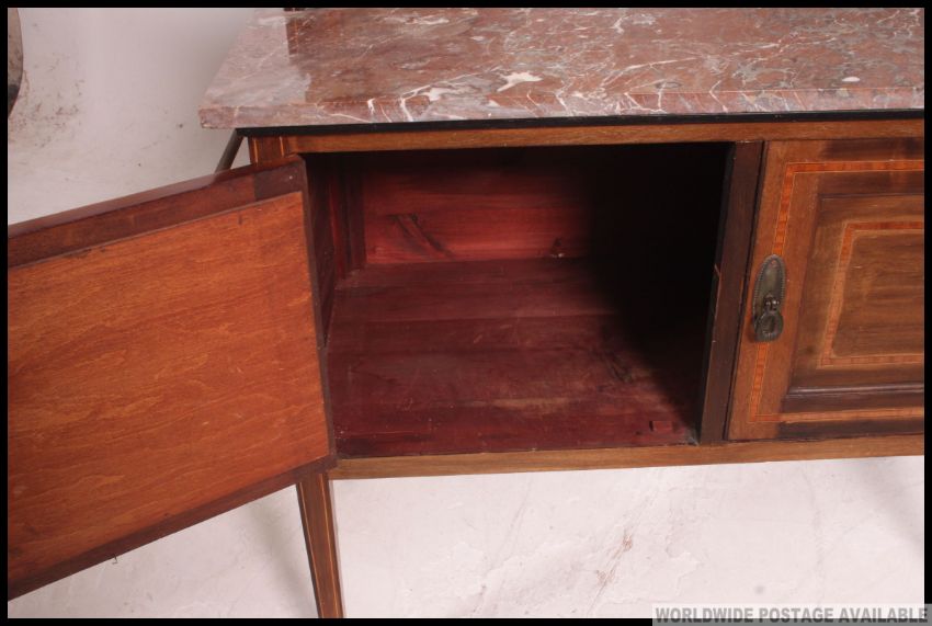 An Edwardian mahogany and marble inlaid washstand hall table. Raised on tapered legs with twin door cupboard under veined marble top and splashback. H110 x W92 x D46cm