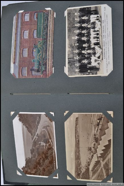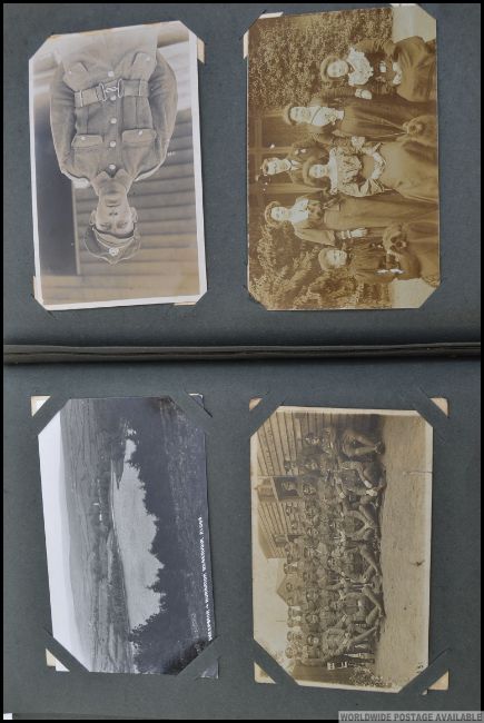 A fantastic early 20th century postcard album containing many transport related train cards, several WWi cards of troops, group and single cards, European and many many more please see images