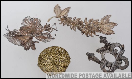 A collection of vintage costume jewellery brooches of filigree workings in silver. Together with a bow brooch with adornments