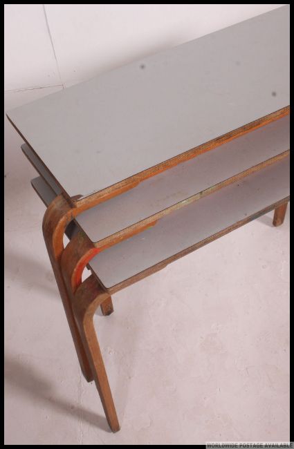 A stack of vintage 20th century stacking school desks. The legs of bentwood form having cream vinyl covered tops to each. H62 x W14 x D39cm
