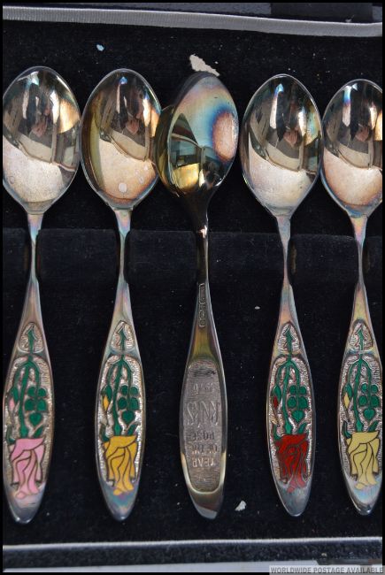 A cased set of 6 silver & enamel hallmarked spoons complete in the presentation box. The handles marked to verso for the Year of the Roses. Hallmarked for Toye, Kenning & Spencer, Birmingham 1976. Total weight of spoons 123g