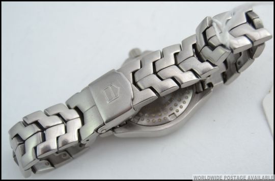 A ladies Tag Heuer Link limited Edition Tiger Woods stainless steel wristwatch. Having baton numerals and date aperture to textured dial with fascimile red Tiger Woods signature being set on stainless steel chevron link bracelet
