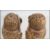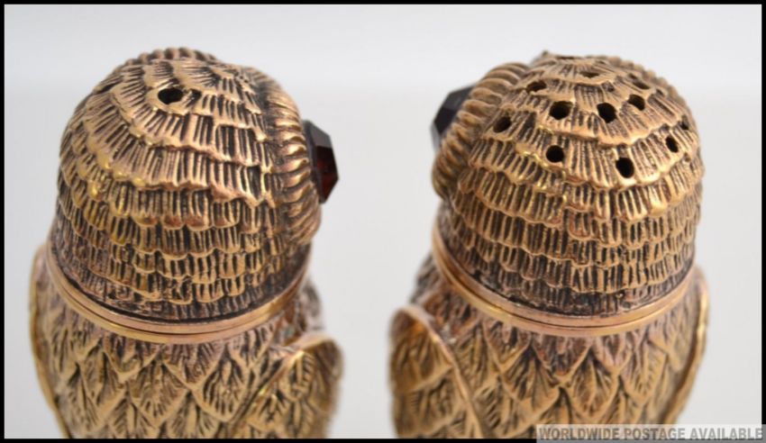 A pair of continental white metal silver ( stamped 800 ) gilt owl condiments with glass eyes.