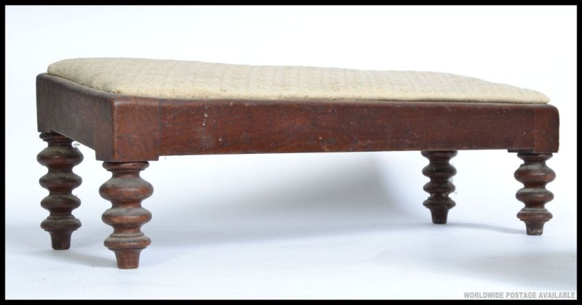 A 19th century mahogany bobbin leg angular prayer stool together with a believed Georgian 18th century brass and copper bed pan with bobbin turned handle and fret pierced brass pan