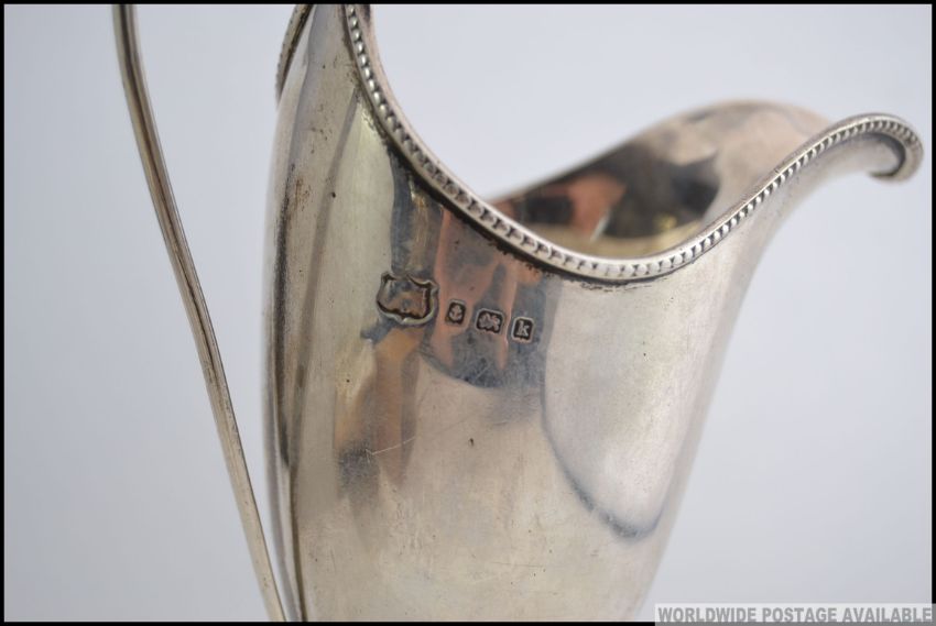 A silver hallmarked jug raised on plinth with scrolled handle bearing hallmarks for Birmingham, date letter K, makers illegible 139g