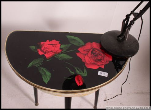 A retro vintage hall table / dressing table with chintz rose to top, vinyl upholstered sides and tapered legs, along with a vintage Impega anglepoise lamp.