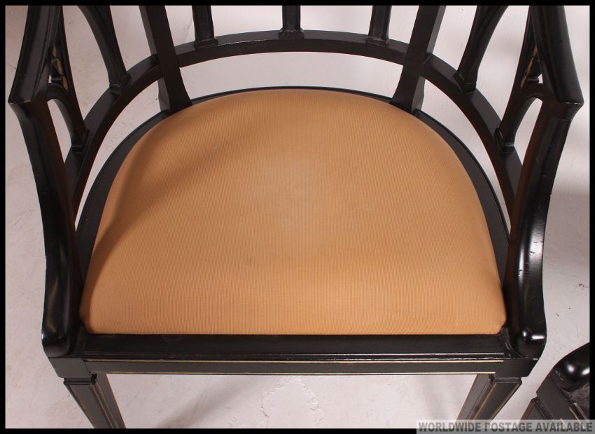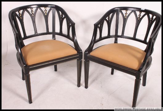 A pair of Regency revival ebonised and parcel gilt library chairs. Raised on tapered legs with padded seats having eclesiastical lattice worked back rests. H81 x W60 x D50cm