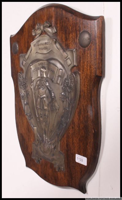 A retro vintage 1950's Dr Barnardo's plaque of white metal construction set to a wooden armorial plinth back