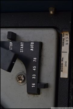 A vintage cased four speed portable record player by Ferguson, having a single speaker to the front, liftup lid secured by side catches finished in blue vinyl