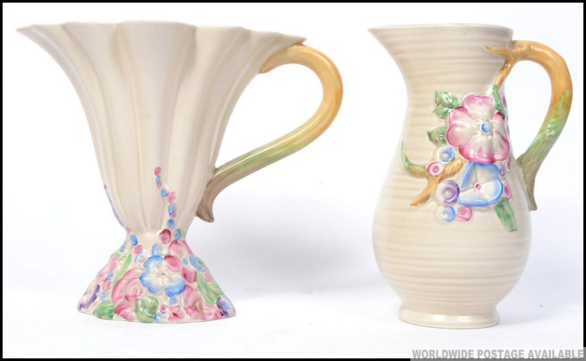 A Clarice Cliff reeded conical vase on foliate moulded base marked 830 along with a Clarice Cliff Jug of similar pattern with moulded foliate to body. Both stamped to base. H19cm
