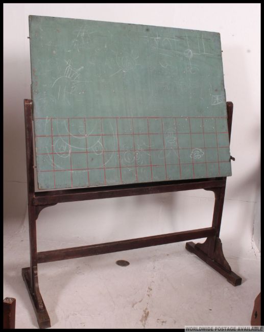 An amazing full size retro early 20th century oak blackboard. The board raised on squared legs united by lower stretcher with chalk tray beneath board