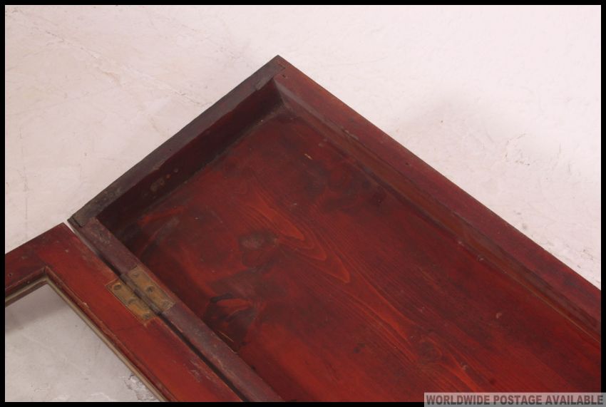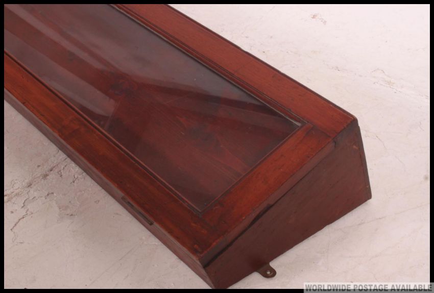 A good early 20th century shop display cabinet case of angular form with glazed opening cabinet door top. H28 x W106 x D19cm