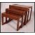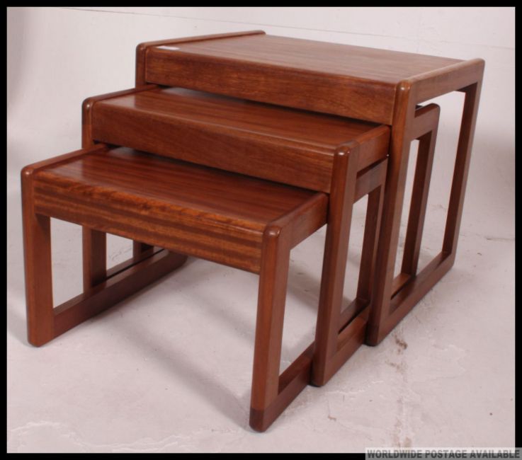 A vintage mid century teak / rosewood nest of tables being raised on squared legs with graduating tops to each
