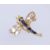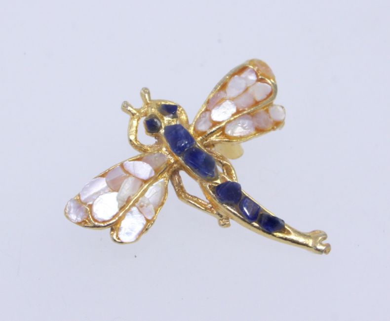 A vintage yellow metal brooch in the form of a dragonfly set with mother of pearl and blue gem stones with roller clip clasp. Measures 2.5cms. Weight 3.2g
