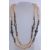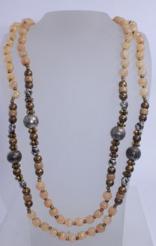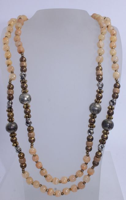 A vintage agate bead necklace with yellow and white metal beads. Measures 75 inches. Weight 144g.