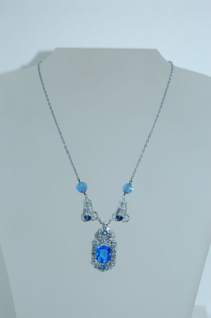 A 1950s white metal Czech necklace with filigree pendant decorted with filigree and blue glass stones with blue clasp. Chain measures 16 inches.