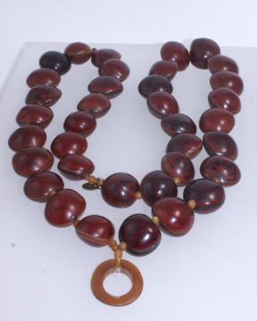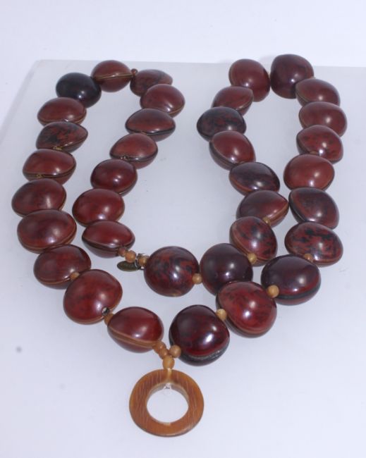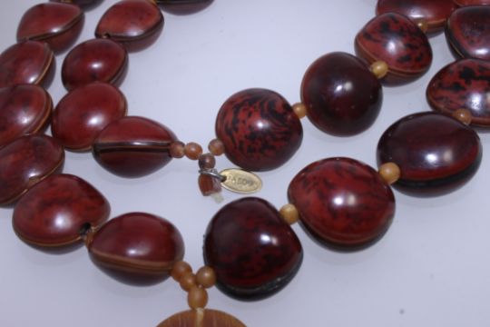 A vintage designer necklace strung with Atlantic drift seeds being large Sea Purse Dioclea SP. Monogram tag for Jeager. Measures 34 inches.