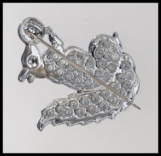 A 1950s white metal faux marcasite brooch of a squirrel with enamelled tail blue paste eye holding a simulated pearl nut. Measures 4cms.
