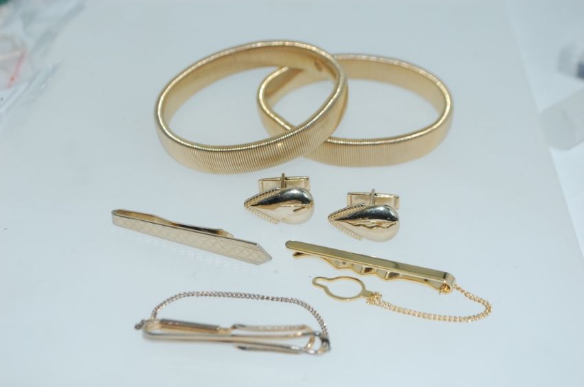 A pair of vintage yellow metal shirt cuffs together with three yellow metal tie clips and a pair of cufflinks.