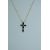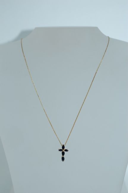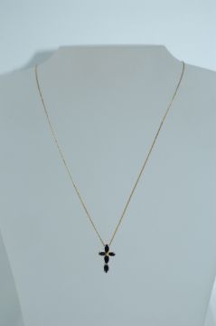 A 925 silver gold plated necklace strung with a crucifix cross set with black jet faceted stones. Marked 925. Measures 18 inches.