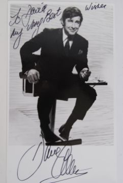 DAVE ALLEN: A 1970's black and white publicity photograph of comedian Dave Allen. Signed in black ink to the white border, with dedication to top. Along with original letter from Allen's secretary thanking the writer for the letter. POSTAGE: Tracked UK postage £3.99+VAT, combined rates available on multi-lot purchases. Europe from £6.99+VAT, USA from £15.99+VAT. ALL DESTINATIONS AVAILABLE, PLEASE ASK FOR A QUOTE, SEE WEBSITE FOR DETAILS: www.eastbristol.co.uk.