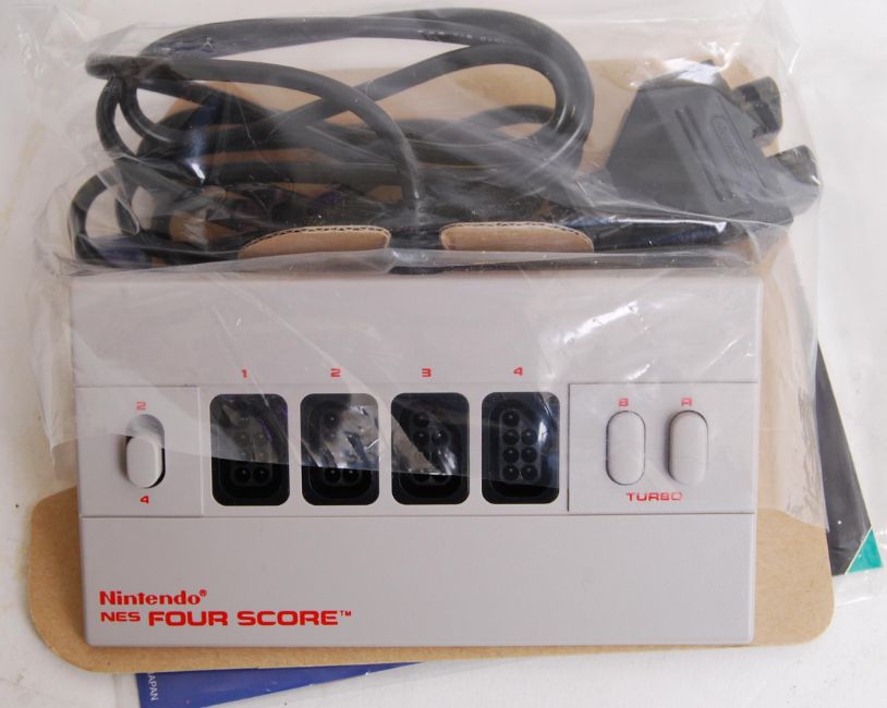 NINTENDO NES: An original Nintendo NES Four Score four player module in original box. All items came from a private collection of vintage SEGA , Nintendo , PlayStation , Atari , Game Boy , Game & Watch and other game consoles. All lots have been tested and do appear to work - however, buyers are reminded to satisfy themselves as to condition prior to bidding and all items are still 'sold as seen.' Worldwide postage is available on all lots - UK £15.99+VAT, Europe from £22.99+VAT, USA from £30+VAT - . Please see website for full postage quotes.