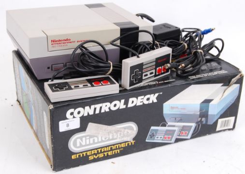 NINTENDO NES: A Nintendo NES game console, in original control deck box, with controllers, power supply, etc. All items came from a private collection of vintage SEGA , Nintendo , PlayStation , Atari , Game Boy , Game & Watch and other game consoles. All lots have been tested and do appear to work - however, buyers are reminded to satisfy themselves as to condition prior to bidding and all items are still 'sold as seen.' Worldwide postage is available on all lots - UK £15.99+VAT, Europe from £22.99+VAT, USA from £30+VAT - . Please see website for full postage quotes.