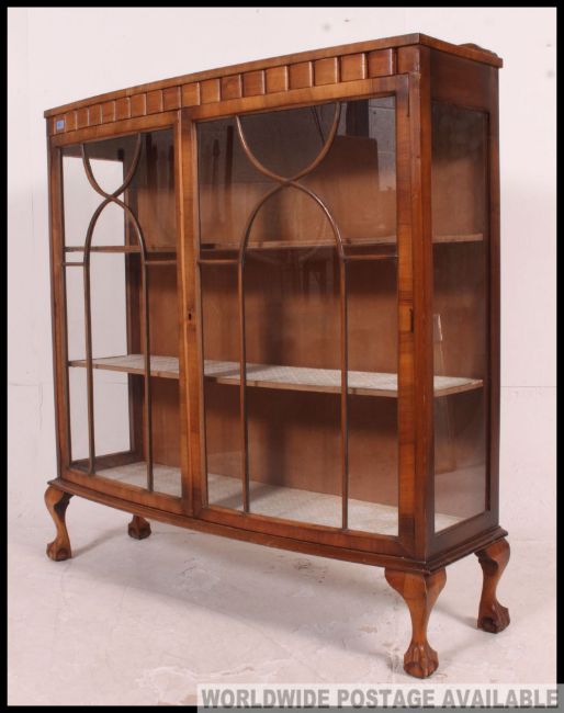 A 1930's Art Deco walnut bow front china display cabinet raised on cabriole legs with ball and claw feet Measures: 127 x 118 x 38.