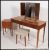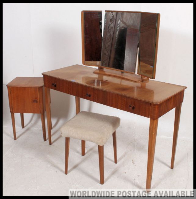 An original Gordon Russell walnut dressing table of five drawers with triple mirror having fabulous sliding trapdoor trinket section. All raised on tapered legs being stamped Russell of Broadway. Matching chest of drawers & wardrobe also available. Measures:131 x 122 x 50.