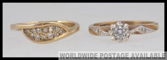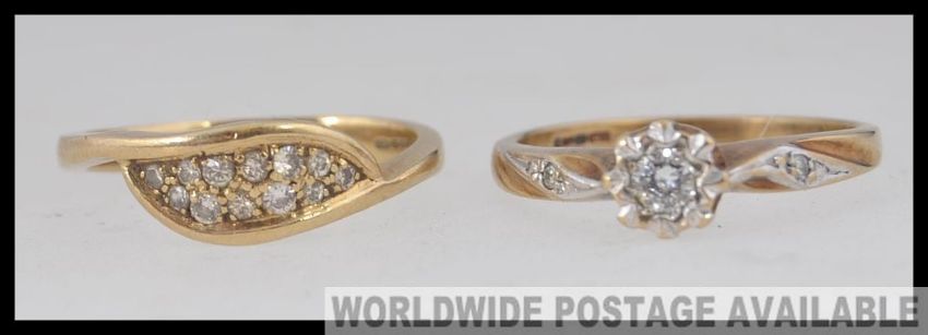 2 ladies 9ct gold rings to include a single stone ring with approx 15pnts of diamonds together with a cluster set diamond ring. Total weight 4.4g. Sizes N.5 & M.5