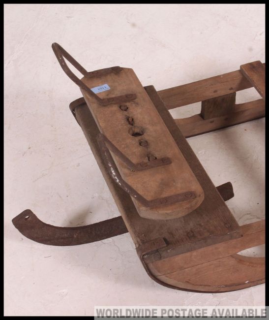 Traditional wooden early 20th century Husky sledge, with iron 'steering blade' to front.