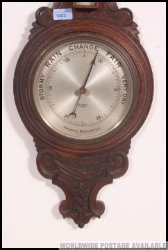 An earrly 20th century aneroid banjo barometer, set in a carved oak surround being marked Selfridge London