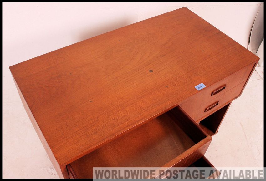 A good 1970's retro teak wood Danish influence entertainment low side cabinet of angular form having sectional body with drawers. Measures: 56 x 87 x 46.