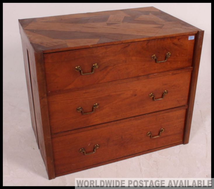 A Victorian mahogany chest of drawers with brass handles to the 3 drawers havin unusual upcycled specimin veneer top above