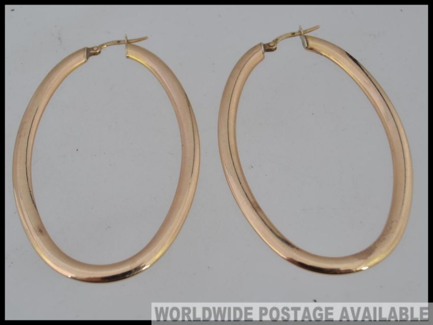 A pair of large Italian designer hallmarked 9ct gold hoop earrings with post clip clasps. Measures 6cms. Weight 3.4g.