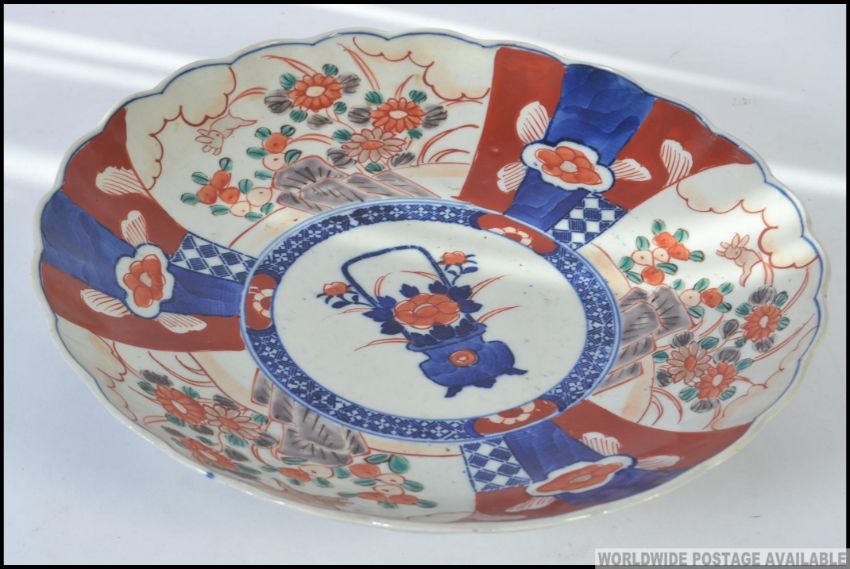 A 19th century Imari pattern plate with geometric red and blue borders having central chrysanthemums in basket W30cm