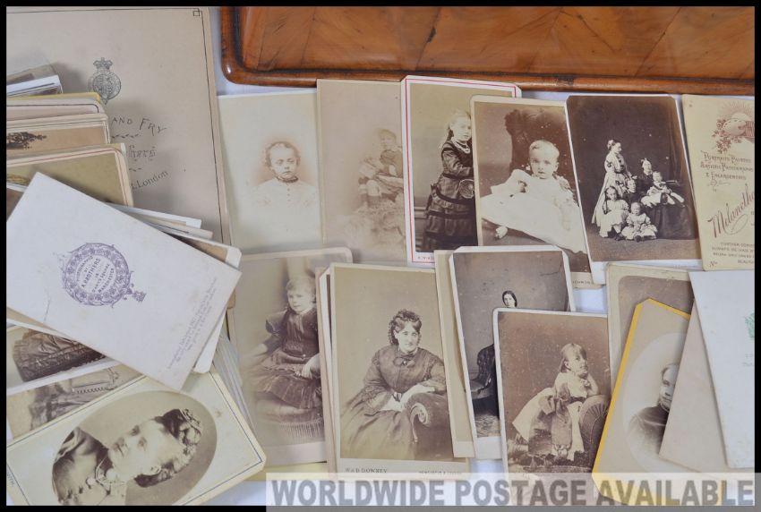 A collection of cartes de visite - portraits dating from the late 19th century / early 20th century set within a good Victorian walnut workbox