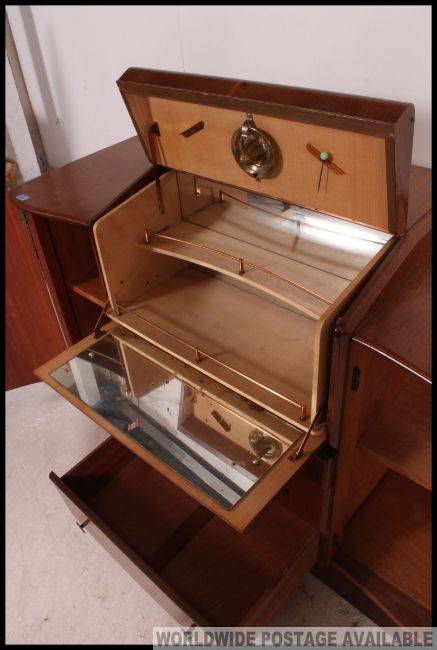 A 1930's Art Deco oak cocktail drinks cabinet / sideboard with central metamorphic drinks cabinet having mirror lined interior with further cupboards to the sides Measures: 96 x 138 x 50.