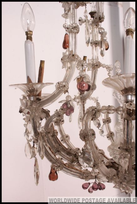A 20th century vintage large 8 branch glass chandelier. The fabulous 8 branches having glass arms and droplets with finial glass stem