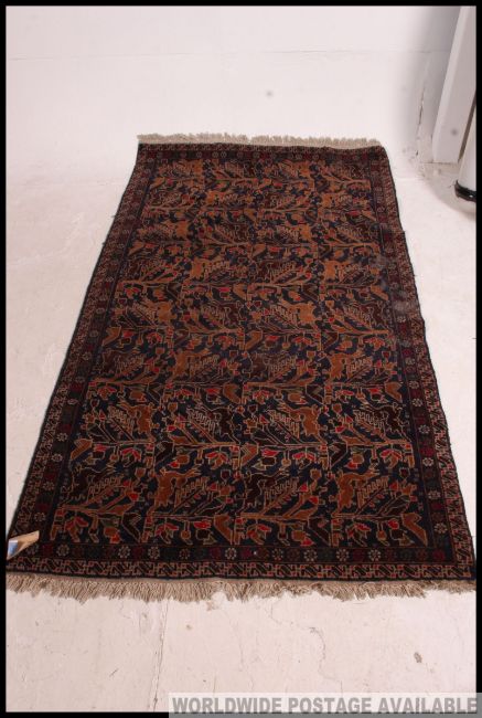 A Persian handwoven rug blue ground with geometric borders and hare / rebbit design