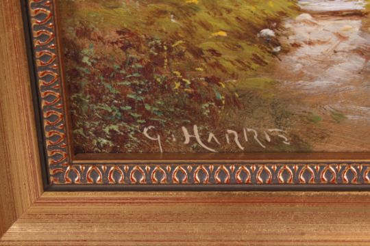 George Harris (1847-1915) An oil on panel painting Wickham Bridge, River Frome, Stapleton near Bristol. Riverside scene being signed to the corner by the artist set in a gilt frame
