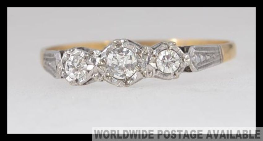 An 18ct gold and platinum vintage ladies diamond ring. The 3 stone setting with approx 25pnts of diamonds, Size X / Weight 2.6g