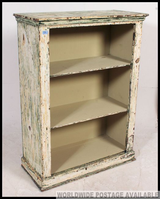 A Shabby chic painted and distressed open window bookcase cabinet with flared cornice over fixed shelves Measures: 125 x 91 x 41.