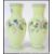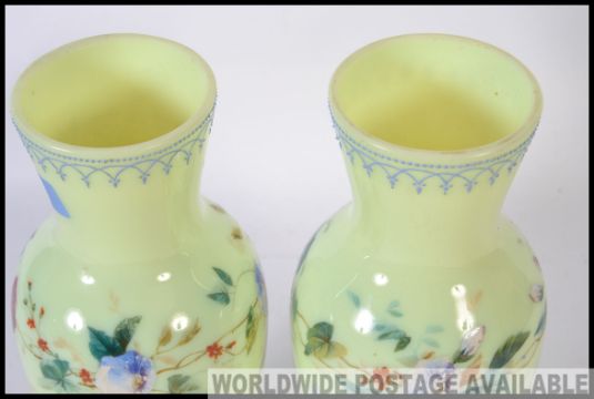 A pair of Victorian green glass handpainted vases with decorative foliate designs H29cm
