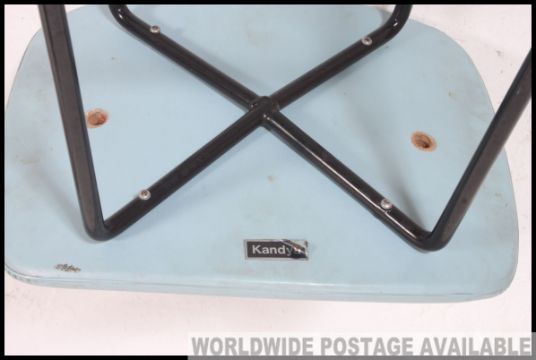A set of 4 retro 1960's Kandya vinyl and metal upholstered stools. The blue vinyl seats with tubular metal supports bearing makers marks to the base Measures: 53 x 38 x 30
