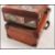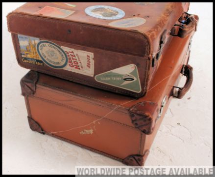A near pair of vintage leather suitcases, with many original travel / shipping labels to include Cunard along with many hotel lables mainly from France and England, please see images