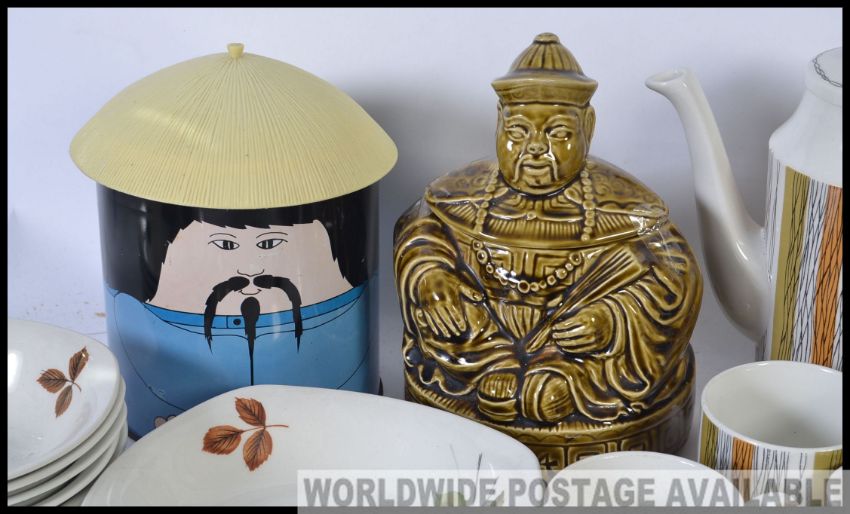 A set of retro Mid Winter coffee service and dishes, a Sadlers Chinaman caddy and a retro tin