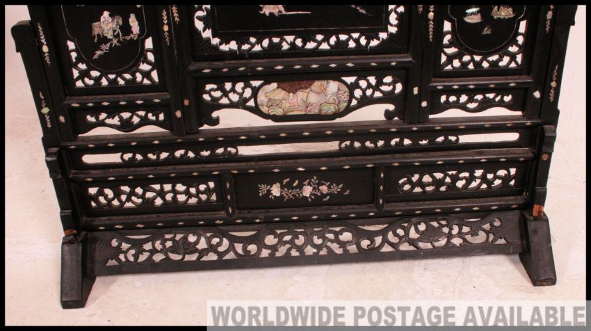 A 19th century mother of pearl and ebony Chinese screen / discretion panel. The mother of pearl inlay to the fret pierced upright stand with shaped stand beneath ( af )