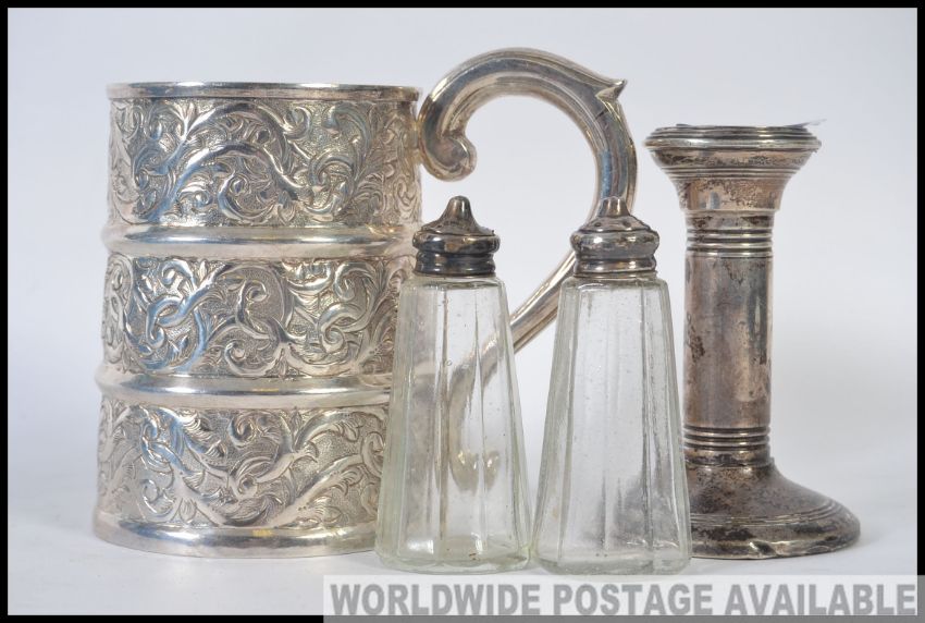 A collection of flatware to include a Silver hallmarked candle stick, along with a good quality tankard, cruets, flatware etc