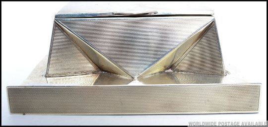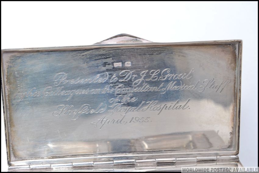 A stunning Art Deco silver hallmarked twin capstan inkwell. The angular body with hinged top revealing twin glass wells. Engraved to the inside lid for Presentation to Dr Grout Sheffield Hospital 1955. Stamped for Sheffield 1947. Total weight. W17cm